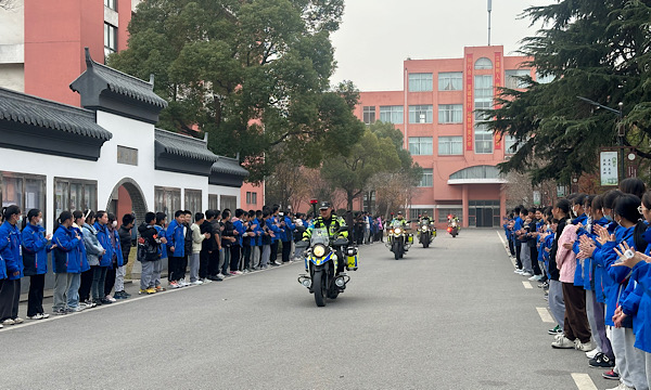 12月14号下午,伴随着“轰轰轰”的摩托车发动机轰鸣声,惠山区交警大队玉祁交警三中队的四名交警进入学生的视野,由学校安全副校长薛校长负责,校办、安全处、总务处、德育处共同协作配合举行的2023年交通安全进校园活动在学校中央大道上正式开始。