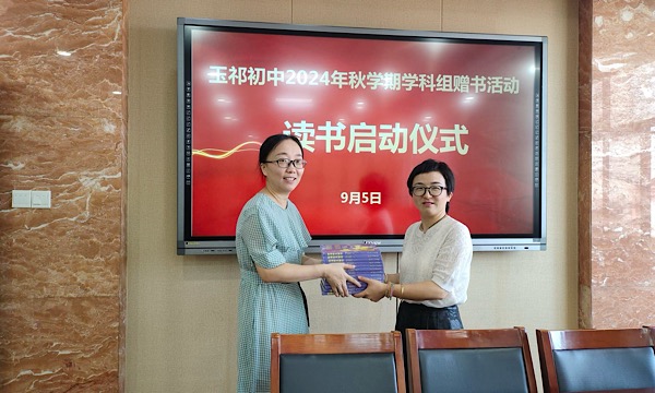 9月5日,玉祁初中启动了2024年秋学期读书活动,物理组杨静娴组长推荐的《新课程关键词》一书成为物理组本学期必读书目,在玉祁初中学科组赠书活动曁读书启动仪式上,由沈建玲副书记为物理组全体组员赠送了所读书籍,并鼓励大家乐读书、勤分享,做一个学习分享型的教育工作者。