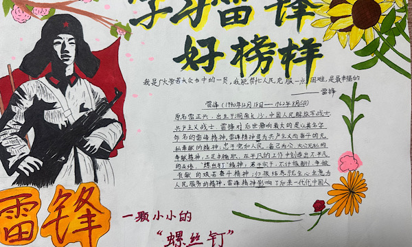 受雷锋精神的感召,同学们用手中的彩笔描绘出了雷锋叔叔的形象,阐释着自己对雷锋精神的理解。一幅幅作品惟妙惟肖,一笔一划都凝聚着对雷锋精神的崇高敬意。